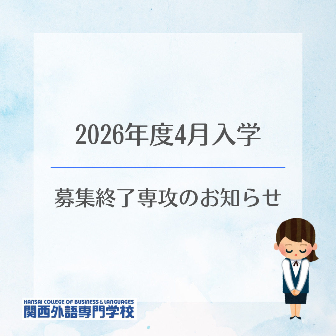 他専攻に関しては募集の継続をしていますが、定員数間近のため、出願の際には先に募集状況を関西外語専門学校入試事務室にお問い合わせください。